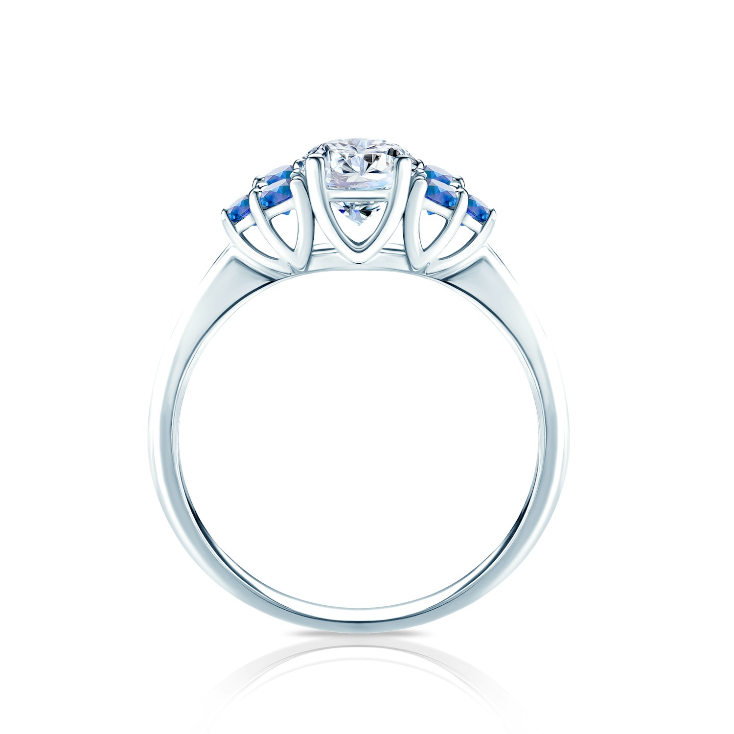 Jedná se o zásnubní prstýnek, na kterém je osazen centrální drahokam bílý safír o hmotnosti 0.50 ct. Bílý safír je v briliantovém brusu. Centrální drahokam je doplněn po obou stranách o 0.03 modré safíry o hmotnosti 6 ct.