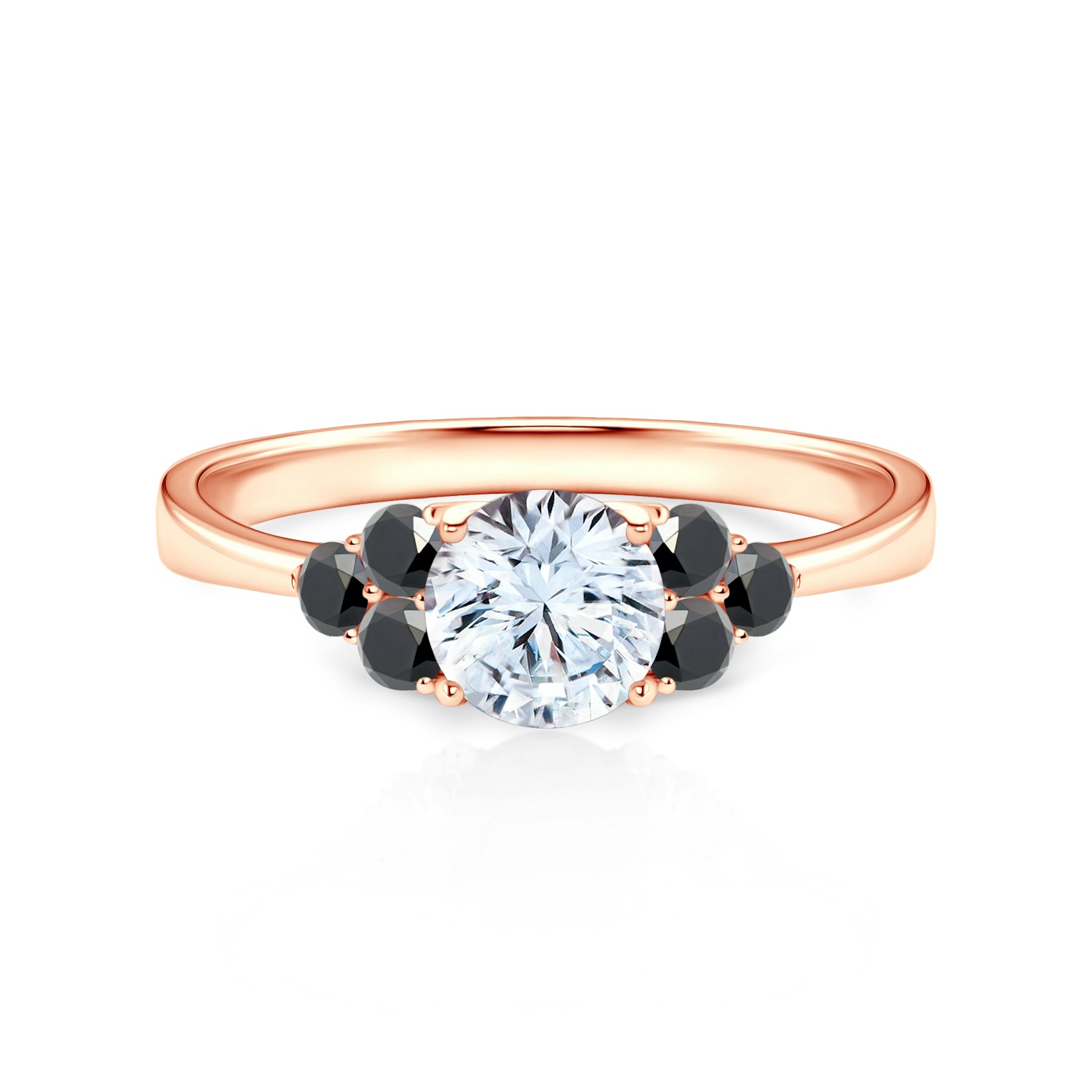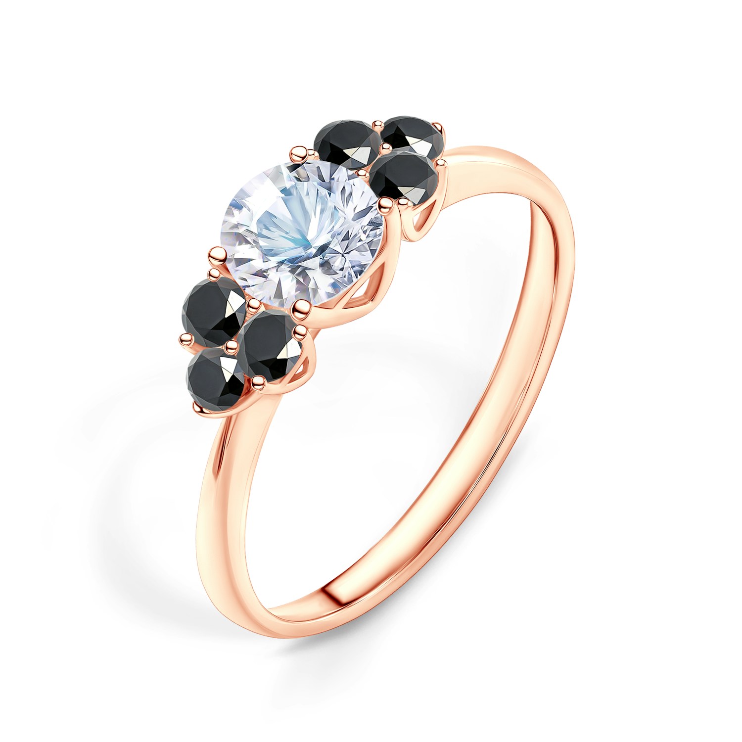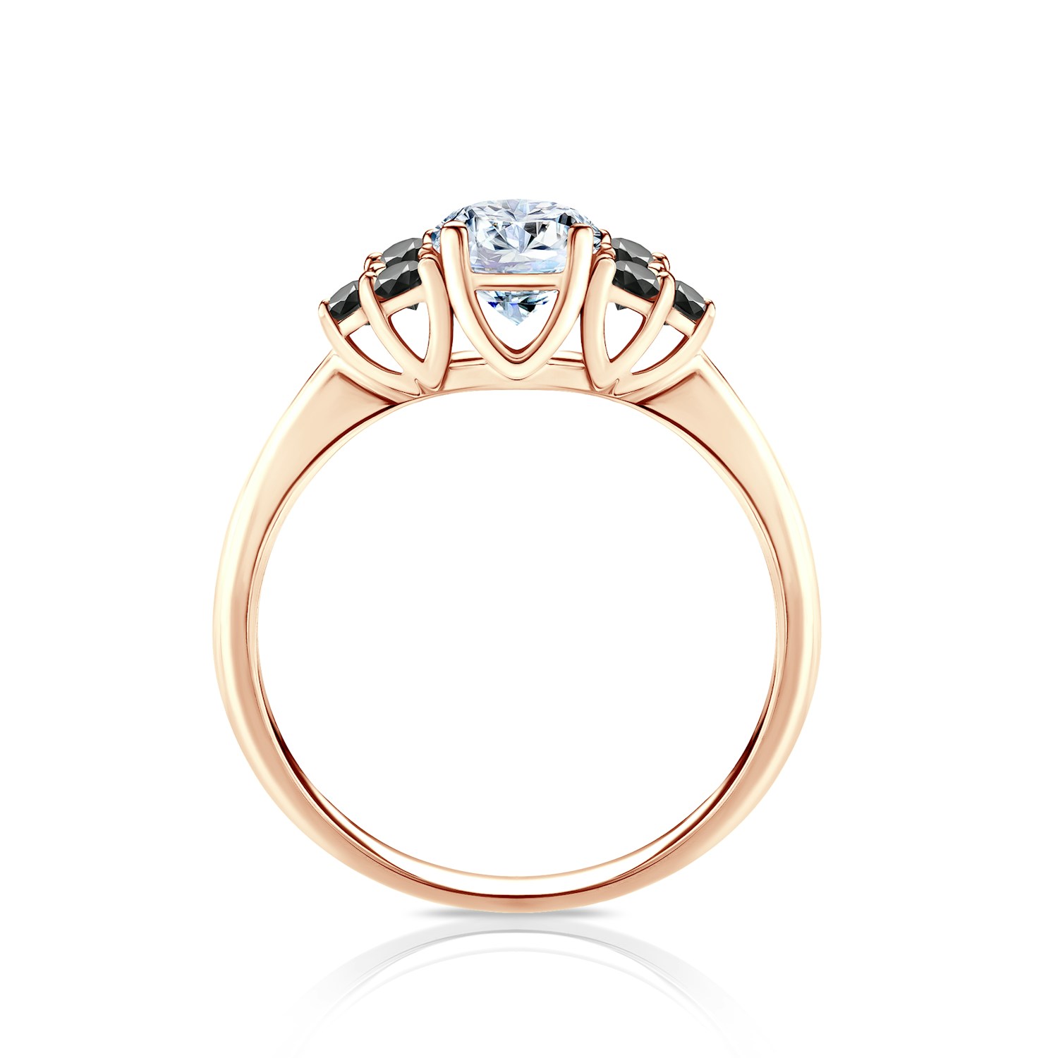 Jedná se o zásnubní prstýnek, na kterém je osazen centrální drahokam bílý safír o hmotnosti 0.50 ct. Bílý safír je v briliantovém brusu. Centrální drahokam je doplněn po obou stranách o 6 černé diamanty o hmotnosti 0.03 ct.